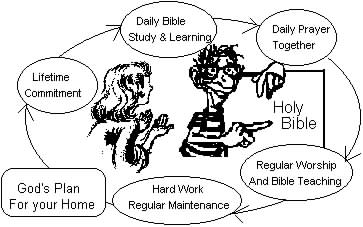 The cartoon above shows God's plan for your home; 1) A lifetime commitment, 2) daily Bible study and learning; 3) daily prayer together; 4) Regular Worship and Bible Teaching (in a Bible believing Church) and 5) hard work with regular maintenance.